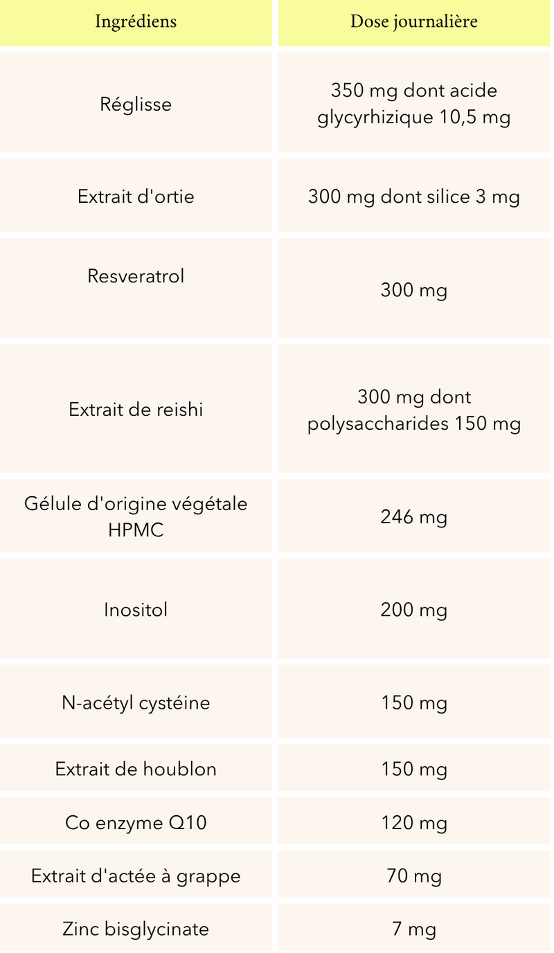 Houblon & Actée à grappes : soutiennent l’équilibre hormonal féminin et aident à stabiliser le cycle.