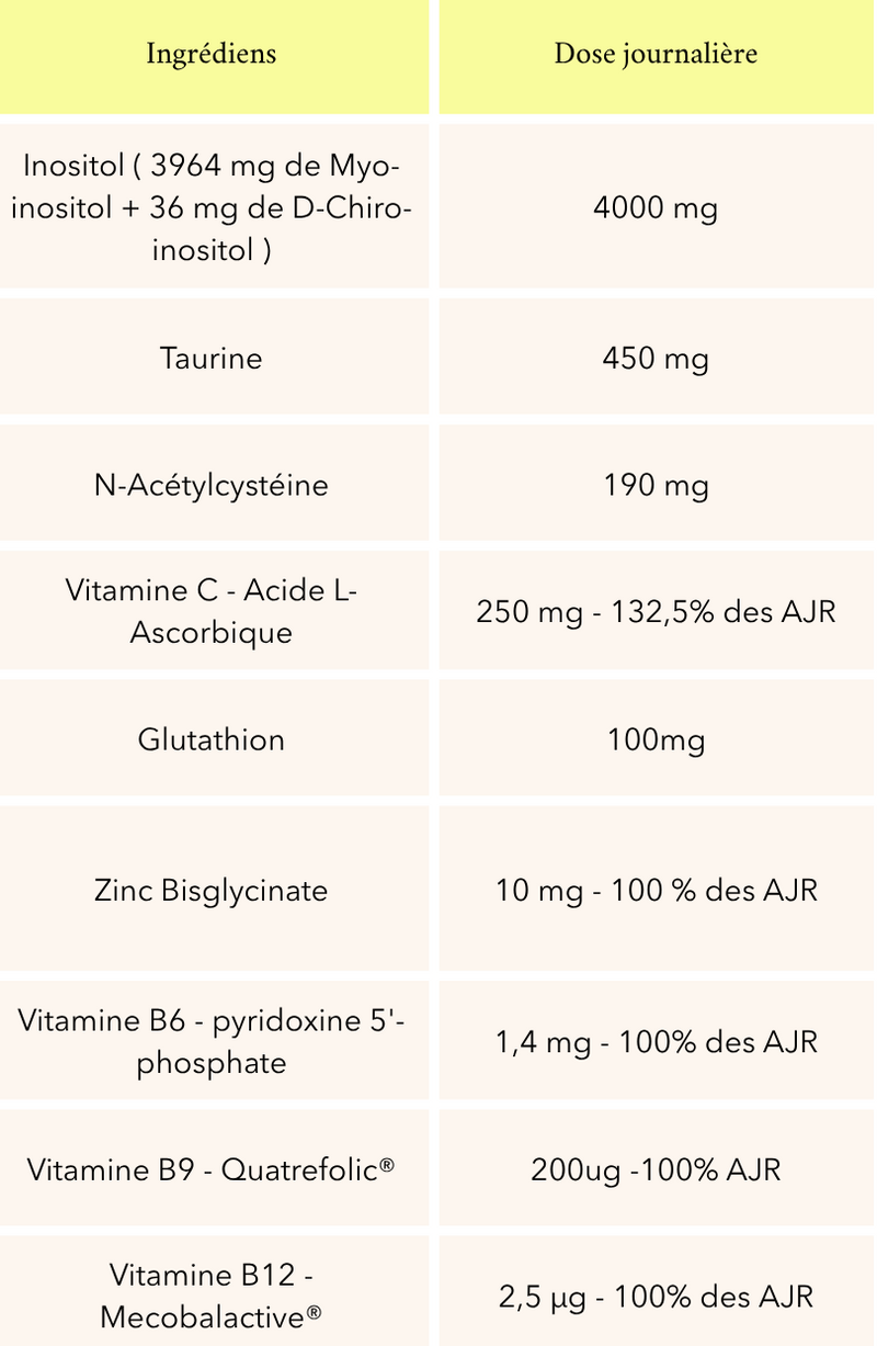 - Inositol et Myo Inositol : L'inositol favorise l'équilibre hormonal et la régulation des cycles menstruels, particulièrement bénéfiques en cas de SOPK et de cycles irréguliers. Ils participent également à l'amélioration de la qualité des ovocytes.