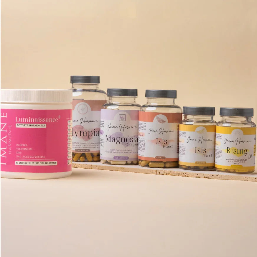 Le Pack Fertilité associe nos produits phares : Olympia (40j) , Luminaissance (60j), Rising D3 (90j), Isis Phase 1(30j) et 2 (30j), ainsi que Magnesia( 60j). Pour favoriser la fertilité et la conception de manière naturelle. Conçu pour les femmes en désir d’enfant et celles atteintes du SOPK, il prépare le corps à la grossesse en optimisant l'ovulation et la qualité des ovocytes. Ce soutien naturel et complet maximise vos chances de grossesse de façon efficace et sûre. Le Pack Fertilité est l’allié idéal pour accompagner sereinement votre projet bébé et améliorer vos chances de conception.