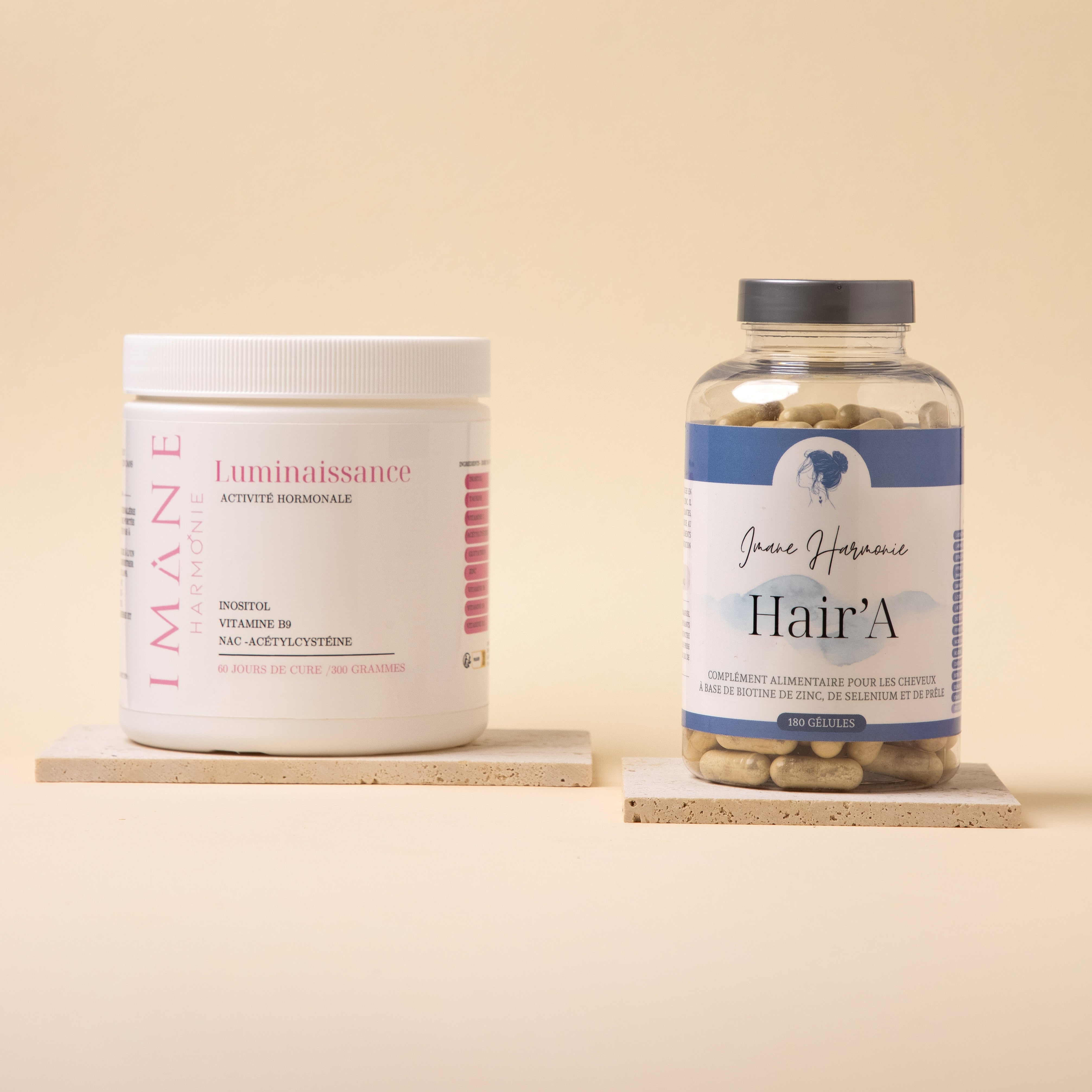 Luminaissance et Hair'a doivent être pris conjointement et peuvent même être associés à nos autres compléments de la boutique pour plus d'efficacité : Olympia ou Hygée Boost, mais également avec de la Vitamine D, Magnésia, Ino stress, Andromaque, Isis Phase 1 et 2.