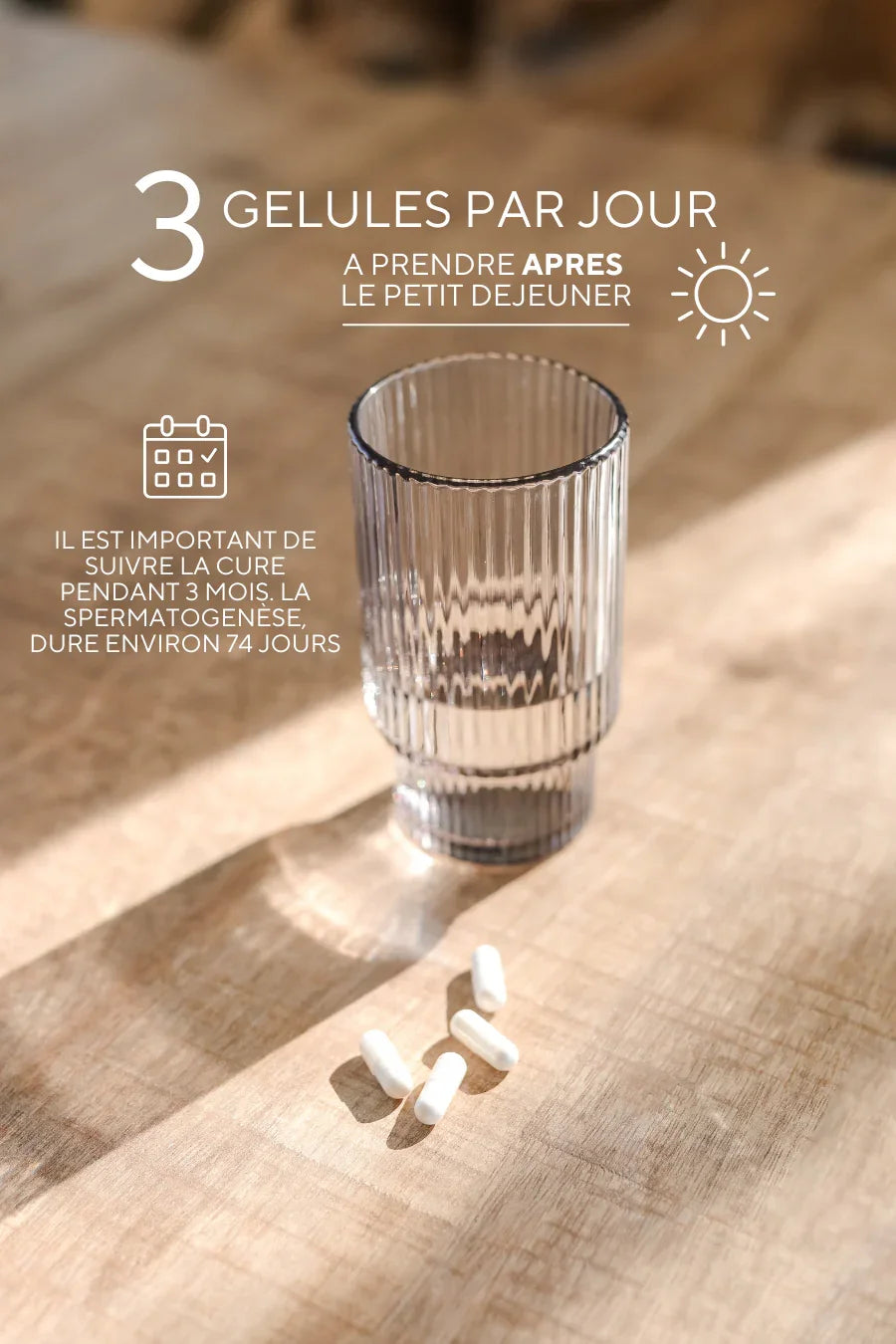 Etape 1 : Prendre 3 gélules le matin, de préférence à jeun ou avec un petit-déjeuner riche en protéines et en bonnes graisses (ex. œufs, avocat, noix) pour une meilleure absorption des vitamines liposolubles (D, E). Idéal pour profiter des effets énergisants de la L-arginine, L-carnitine, ginseng, et coenzyme Q10, qui soutiennent la production d'énergie et la vitalité.